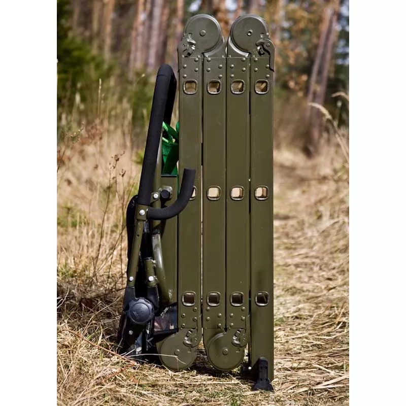 Aluminiowa, rozkładana konstrukcja. Siedzisko z rur aluminiowych spawanych metodą TIG i malowane proszkowo. Wodoodporna sklejka siedzenia pokryta jest miękkim pikowanym materiałem. Podpórka pod broń (w miękkiej otulinie) ma regulację wysokości i kąta nachylenia.