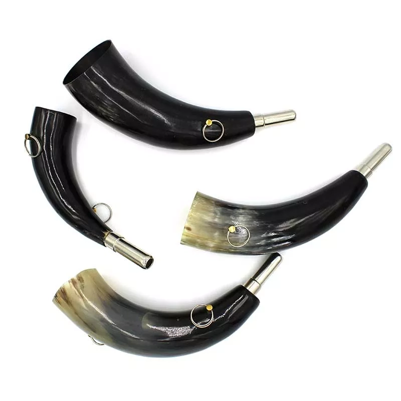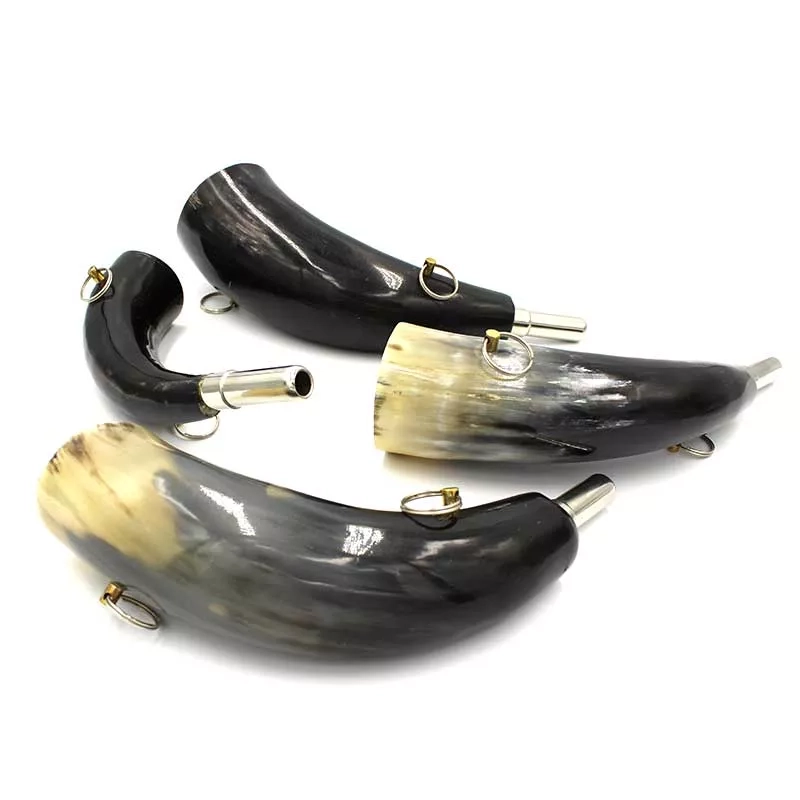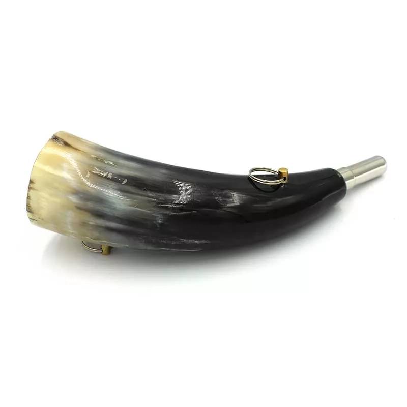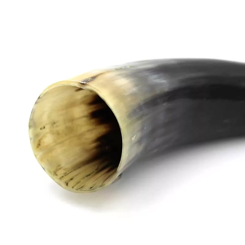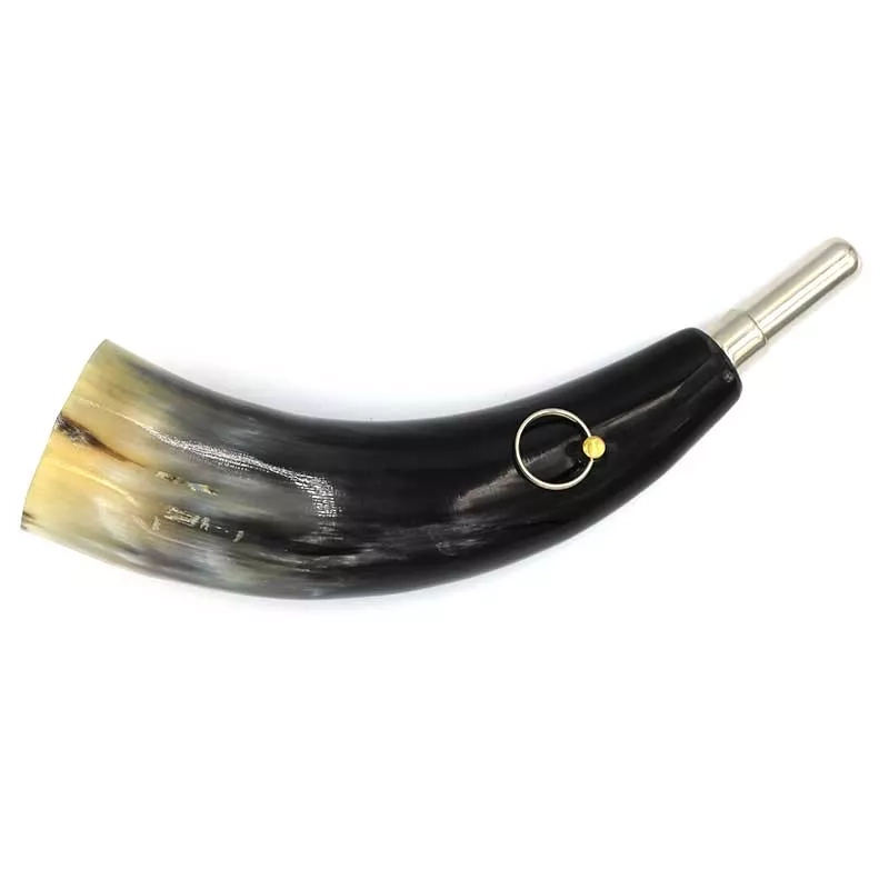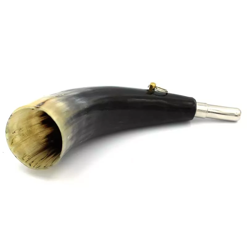 Tradycyjny róg myśliwski, ręcznie wykonany z naturalnego rogu domowego bawoła indyjskiego (Bubalus bubalis).