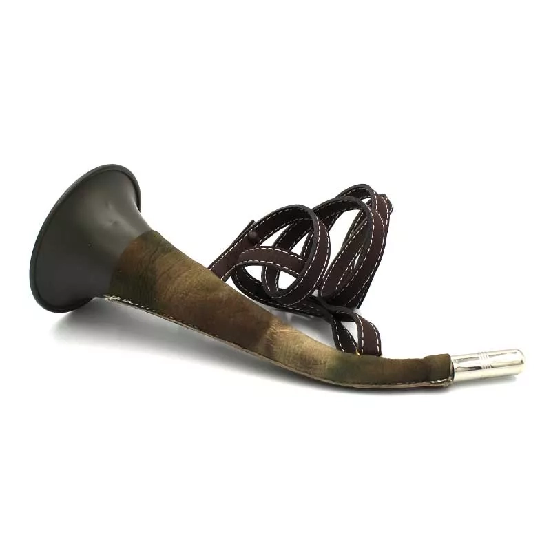 Trąbka myśliwska w kolorze zielonym w skórze camo. Delikatnie wygięta.